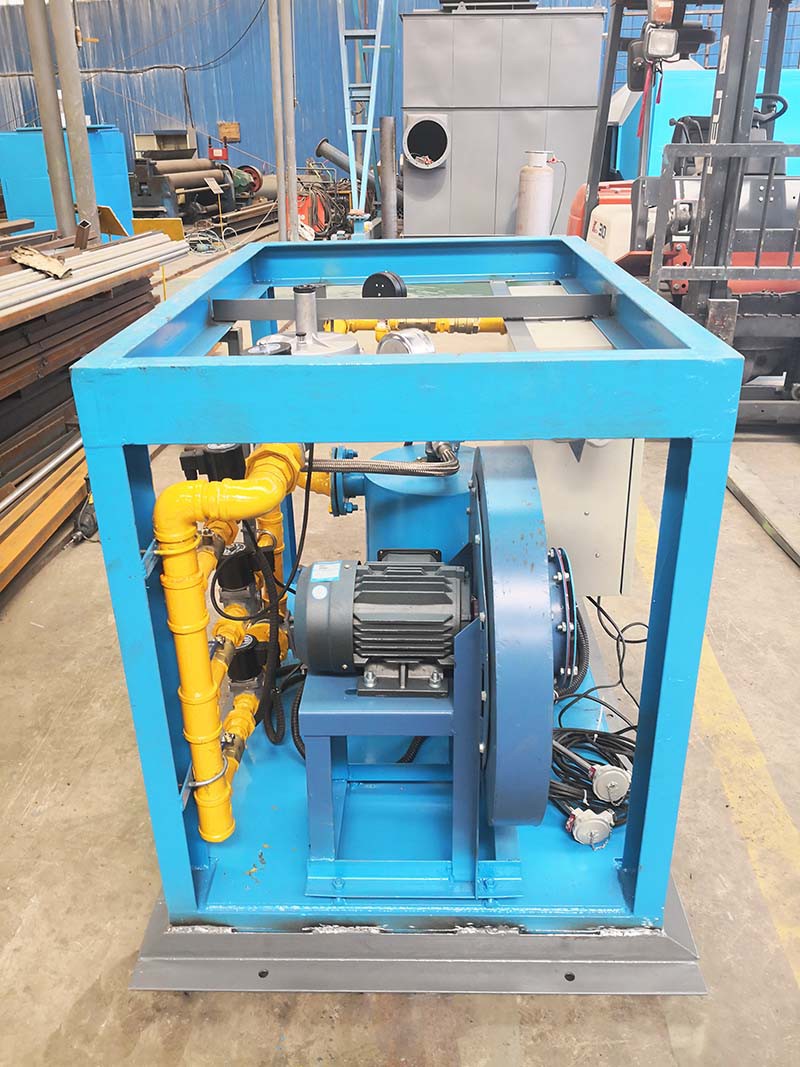 中間包烘烤器:包括燃燒器、鼓風(fēng)機、助燃風(fēng)管道系統(tǒng)和煤氣管道系統(tǒng),所述助燃風(fēng)管道系統(tǒng)一端連接鼓風(fēng)機,另一端接入位于燃燒器前的煤氣管道系統(tǒng),還包括通過控制煤氣管道閥門開閉自動調(diào)節(jié)溫度的控制系統(tǒng),所述燃燒器為1-5個(根據(jù)膜胎尺寸確定),中間包工作層受熱均勻,易脫模節(jié)能效果明顯。